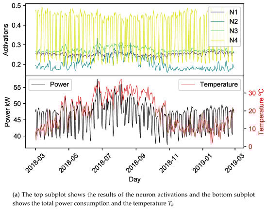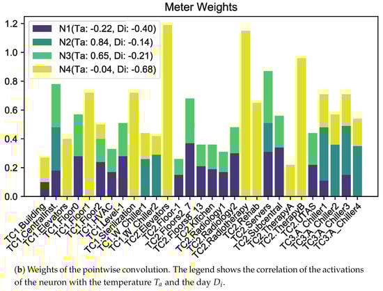 As it can be seen in the bar chart (Figure 9b), the pointwise convolution discovers basically three types of circuits. The ones that only have a neuron 4 component are the circuits related to medical equipment and systems that strongly depend on the building occupation. The circuits related to the cooling systems whose consumption is higher during the summer. In addition, the meters that have weights in the neuron 1 and 3 and that are related to the rooms and the support systems, so they have fewer consumption peaks and the consumption is more and less constant.