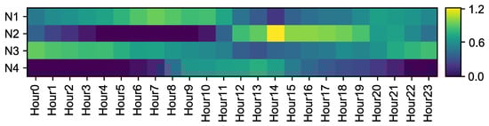 The hourly influence of the meters can be obtained by analyzing the weight of the Depthwise convolution. Since we are using a filter of dimension 24 and the output is only one neuron per meter, there is a weight matrix of dimension 24 × 29 that can be visualized as a heatmap in which the color is the value of the weight of the convolution. Figure 8 shows different behaviors depending on the meter: