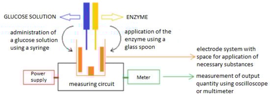 The electrode measurement system (Figure 1) in this work consists of three parts—a power circuit, a two electrode system and a measuring circuit. The main idea is the ability to measure glucose concentration in a solution with distilled water (the measurement is performed to verify that the measuring system is capable of detecting electric current) or to measure glucose in a solution that contains the enzyme glucose oxidase [29] to accelerate the catalytic reaction of the glucose (Figure 2). The enzyme glucose oxidase is used for the electrochemical measurement, which catalyzes the chemical reaction of glucose with oxygen. This produces gluconic acid and hydrogen peroxide, which is reduced by electrochemical action to water and free electrons. This produces a small electric current which is proportional to the glucose concentration in the solution. Measurements are usually distorted by the involvement of oxygen in the reaction (formation of hydrogen peroxide). The method was modified with the ferrocene mediator reagent, which reduces the catalysis of hydrogen peroxide [30,31,32].