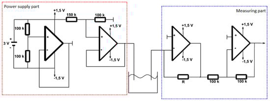 The power circuit (Figure 4) is designed to adjust the incoming voltage to 0.6 volts for the working electrode and then to process the converted voltage from the measuring electrode and measure it using an oscilloscope. The power supply circuit is supplied with a DC voltage of 3 V (two AA batteries in series). The voltage divider is reduced to 1.5 V (using two 100 k resistors). This voltage is then routed to the positive input of the operational amplifier, which monitors the voltage values. The voltage at the input and output of the operational amplifier is therefore the same. An artificial ground is created from the output of the operational amplifier. Another voltage divider with 150 k and 100 k resistors creates a voltage of 0.6 V, which is applied to the working electrode by means of a connecting wire and pinhead [15,28,30,33].