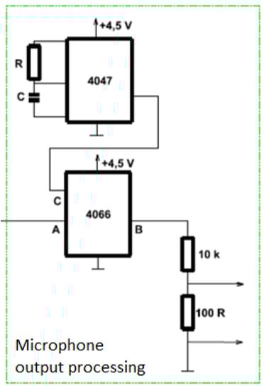 An alternative to the measuring DAQ card is the connection through a microphone input. The proposed converter must be able to process a small direct signal and convert it into the output of the converter which can then lead into the microphone input using a cable with a jack. Here it is then converted into a digital signal using an A/D converter. To use the computer’s microphone input (Figure 6), it is necessary to obtain AC voltage at the output of the converter, which is converted to a digital signal by the A/D converter. When designing the conversion element, we have to consider the microphone input sensitivity, which is 100 mV. The first circuit utilized in this section is the Texas Instruments CMOS Low-Power Monostable/Astable Multivibrator CD4047B circuit operating in a monostable or astable mode. The astable state, when the circuit periodically flips from one state to another, was used for this work. The second circuit 4066 is a low resistance analog switch comprised of four independent double-sided switches. This circuit is used to generate a DC pulse signal. The resulting circuit with the conversion element conducts a signal from the inverter output to the Texas instruments Quadruple bilateral analog switch SN74HC4066 circuit. If the CD4047B circuit turns on logic 1, the input from A is coupled to output B. The output voltage is reduced by a 10 k resistor divider and 100 and then enter the microphone input. A disadvantage of using the analogue microphone input can be the limited non-linearity and pre-amplifier noise.