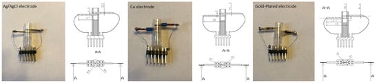 The electrode system was tested on three materials (Figure 7) (Ag/AgCl, Cu and Gold-plated), but primarily on gold-plated and copper wires. Identical dimensions have been chosen for the materials for the easier processing and evaluation of measurement results.
