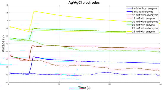 Ag/AgCl electrodes are very often used in medical diagnostics. Therefore, this material was chosen for testing. The Figure 8 shows the course of the electric voltage over time, where there is a sharp increase in the electric voltage of the electrode with the enzyme due to the electrochemical reaction and subsequently the relatively constant course of the electric voltage. Here, the electrochemical reaction and the material used may be unsuitable. Glucose is consumed here, so it is not possible to record real measured values.