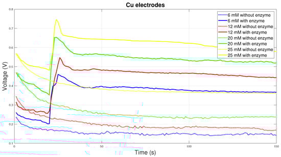 The copper electrodes had a lower voltage than the Ag/AgCl electrodes. In the enzyme-free measurement, the moment of application of the solution was visible (a higher voltage values recorded). When the enzyme was applied, the curves had a sharply decreasing character after reaching the highest value. Copper electrodes have common, more stable values after the application of the enzyme with the Ag/AgCl electrodes.