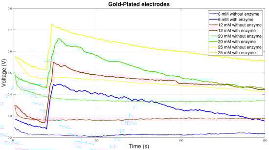 The gold-plated electrodes in the enzyme-free measurement had noticeably higher voltages when applied to the solution than copper electrodes. Thus, the voltage decreased more rapidly. Enzyme values were not more stable than non-enzyme electrodes.