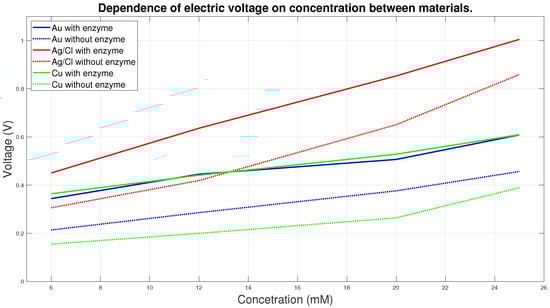 The highest correlation between the voltage and the concentration of the solution was demonstrated with the Ag/AgCl electrodes (Table 2) using the enzyme. The resulting Cu electrodes and Au electrodes had comparable results (Table 3 and Table 4). The results confirmed that there is no linear dependence between the solution concentration and the measured voltage.