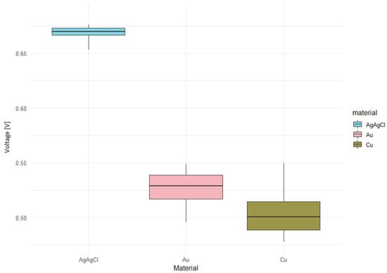 The box graph of the measured voltage at a concentration of 12 mM with the enzyme (Figure 12) confirmed our hypothesis that the Ag/AgCl material will have the smallest dispersion of the measured voltage. This type of electrode is thus capable of recording more precise measured values that the types Au or Cu.