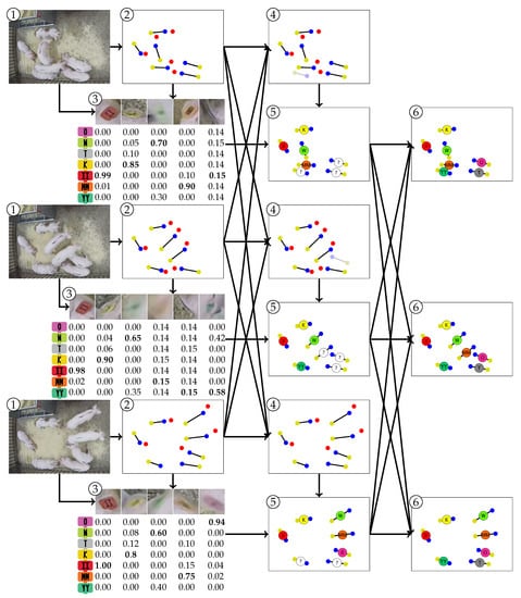 Tracking-by-detection methods begin with a per-frame detector that finds the location of individual instances. In this work, the detection method produces a set of instance locations for each frame . Furthermore, each instance is defined by its two-dimensional, image-space, pairwise shoulder, and tail location, which can be represented by . The detection method also detects the locations of visual markers in the image space. In this work, these locations correspond to the pixel coordinates of the left and right ears of the pigs, denoted and , respectively.