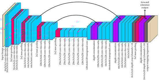 The proposed detection method is largely based on the method presented in [28], and the network architecture is illustrated in Figure 3. Instead of using the original network with maxpooling and maxunpooling layers, the network used in this work adopts a more efficient U-net architecture [67]. This architecture is characterized by the use of depth concatenations following transposed convolutions for upsampling. The depth concatenations serve two key purposes. First, this allows for accelerated training because there are more direct paths from the network output to earlier layers in the network. This advantage was first demonstrated by the ResNet [34] architecture and, subsequently, the DenseNet [68] architecture. The second function of the depth concatenations is to allow the network to produce fine details in the output feature space. Early maxpooling layers remove spatial details and make it difficult for transposed convolutions to produce detailed outputs at higher resolutions. Thus, by concatenating the network output prior to maxpooling after each transposed convolution, the network has access to higher resolution details.