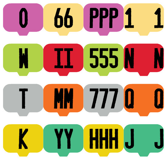 In applications where unique visual identification of animals is important, it is common for livestock to be issued permanent ear tags. Serial numbers are common, however, they are not ideal for visual identification. Therefore, a different set of tags was designed and used in this work. The set of 16 tags, illustrated in Figure 5, includes a variety of different color/alphanumeric character combinations. The specific combination chosen here was intended to be easily recognizable for people, even in difficult viewing conditions.