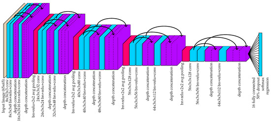 For the proposed tracking system, the tags serve as an absolute way to identify each animal and recover from tracking errors. When an ear is located in the image, that section of the image centered at the ear is cropped to a 65 × 65 image. The cropped image is then processed by the convolutional neural network shown in Figure 6 to provide a likelihood that the observed ear is equipped with one of the known tags. The network was designed using the DenseNet architecture [68] (with ).