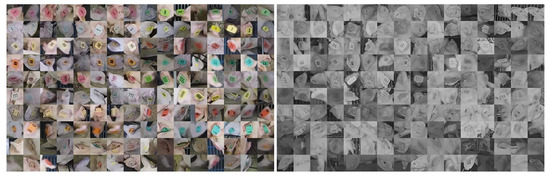 The proposed method identifies both the location and ID of each pig via separate networks. The dataset used to train the detector was introduced and provided by [28]. A set of 13,612 cropped color images of ear tag locations were used to train a classification network. A separate network was trained for grayscale (infrared) images using 6819 cropped images. The crops were labeled via human annotated as either belonging to one of the 16 known ear tags or to a category of “unknown tag ID.” When a tag image is classified as unknown tag ID, its target likelihood vector for training is set to for all categories. Figure 8 provides eight samples of each tag category along with 32 examples of unknown tag ID for both color and grayscale images.