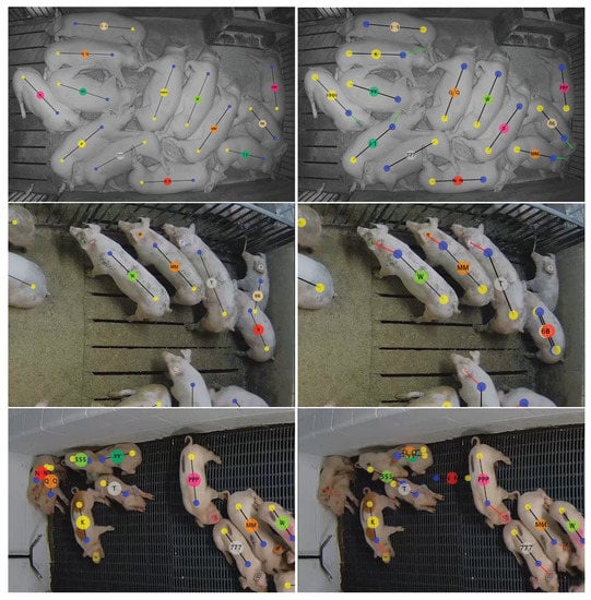 Errors in the third row of Figure 10 illustrate a situation where multiple targets are not detected for long enough periods of time that the method holds their last observed location until they are re-identified. This occurred for two reasons. First, pigs viewed from the side are more prone to occlusion than pigs viewed from a top-down perspective. Second, targets are smaller in this view so the detection network has less pixels and, correspondingly, less features per target. This could be at least partially corrected by processing larger images, but this would come at the expense of longer processing times.