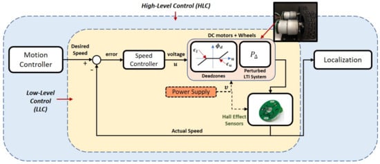In this work, the focus is on robustifying the control law within the LLC layer when the system is subject to the aforementioned structural model errors where the dominant parameters (i.e., ) are not only influenced by the speed profile generated by the motion controller, but also by the time-varying voltage from the power supply (i.e., ). Figure 2 shows the overall closed-loop system in the LLC layer that has been restructured with inclusion of a new robust control scheme to account for the uncertain nonlinear perturbations in the plant’s model. The signal  denotes the desired speed generated from the HLC layer while the signal x represents the actual speed of the DC motors measured by Sensor A, which is the hall effect sensor. As the deadzone widths and the plant’s gain are uncertain and dependent on the time-varying power supply, Sensor B is included in the inner loop to measure the voltage driving the DC motors. The main methodology is presented in the following section.