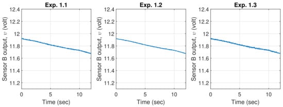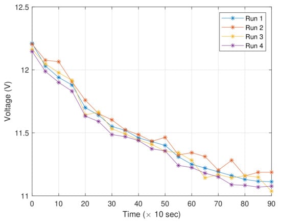 The targeted application of this paper is on precise motion control of a low-cost WMR where a single 3S (3-cell) Lithium-Polymer battery is used as the main supply to power the two DC motors (will be denoted Motor A and Motor B henceforth), the sensors and the control system. It is worth noting that while the whole system can run within the power supply’s operating voltage range (i.e., 11.1 volts to 12.4 volts in this case), the actual voltage to supply the system, , can fluctuate within the range due to the nonlinear discharging rate, effects from the ambient temperature, types of motions, as well as load from the sensors. An illustration on the variation of the voltage is depicted in Figure 3 where four samples were recorded; Run 1 and Run 2 represent the cases when the power supply were used to drive the motors at PWM of 50 and 100, while Run 3 and Run 4 represent the same cases as Run 1 and Run 2, but with the sensors attached. The fluctuation may also become higher when the WMR has been running for a longer period (due to the increase in temperature within the WMR).