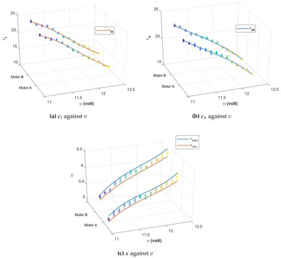 for Motor B. These are represented by the curved line plots in Figure 4a,b, respectively. With regard to Figure 4c, the change of input datasets leads to a relatively larger variation in the value of  as compared to the observations from  and . Hence, a regression technique is used to formulate the correlation between  and both the lower and upper bounds of . The lines of best fit are shown in Figure 4c with parameters as follows: