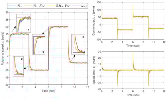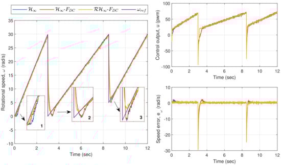 In the case where structural model errors (i.e., deficiencies or artifacts in the selected model [,]) are more dominating than the effects from environments or noise disturbances, accurate system modelling will be highly instrumental in synthesizing the best compensator. Treating the uncertainties in both linear and nonlinear models are equally crucial for enhancing the tracking performance under various circumstances particularly when the system involves multiple DC motors, such as those in wheeled mobile robots (WMRs) [,]. Plus, to ensure the compensator is robust against the uncertainties, the source of variations in the model parameters needs to be identified and made auxiliary to the control scheme. Exact sources of errors or uncertainties are often difficult to determine, but influence from other observable parameters, such as electrical energy consumptions [,] or nature of motions [,] can assist in achieving the same purpose. An interesting study in [] shows that the electrical power consumptions in a mobile robot can fluctuate under various operations when the same energy supply is used to power the sensor, motion, and control systems.