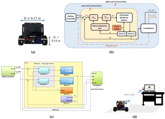 While much effort has been devoted to energy modelling, power conservation, and optimization techniques [,] for precise tracking of WMRs, to the best of the author’s knowledge, there has been to date little or no attention given towards investigating the effects of the power supply variation on the model’s parameters. The main contribution of this work is on enhancing the tracking performance of a WMR, which is driven by two DC motors that are subject to structural model errors that are induced by time-varying power supply as well as behaviour of motions and motor speed. By taking into account the variations of both the model parametric uncertainties and uncertain deadzones into the control law, the WMR is able to self-optimize the tracking performance which is particularly important for movements in remote areas that typically do not allow human interventions in the middle of operations. In this work, the system is firstly modelled where correlations between the model parameters and different input datasets as well as supply voltage are obtained via polynomial regressions. Motivated by hybridization of two control approaches to improve performance [,], a robust compensator is proposed by fusing a structured  controller to treat the parametric uncertainties in the linear model, and an FLC to alleviate the effects of the varying deadzones. Via the proposed strategy, the  controller and the FLC work in tandem to ensure the control law is robust against the model uncertainties. The proposed technique was validated via a series of real-time experiments, which showed that the speed and path tracking performance can be considerably enhanced when compared with the results via the  controller alone, and the  with the FLC but without the presence of the robust control law.