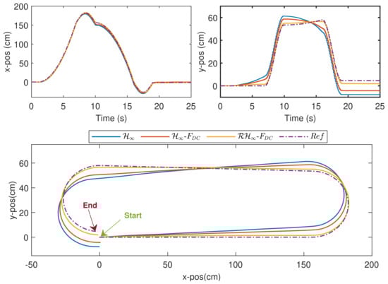 as the steady-state position error. The experiment was repeated three times and the numerical results with average values were summarized in Table 4. From the table, although the speed errors for  and  are slightly reduced via -, the impact on the path tracking performance can be clearly seen where the corresponding maximum position deviation is only  cm, which is much smaller than that via  and -, where the resulting deviations are, respectively,  cm and  cm. The smallest error can also be obtained via the proposed strategy for  and . Hence, when compared with  alone, although - managed to slightly improve the performance as in the speed tracking analysis, a considerable error reduction can only be achieved via -.