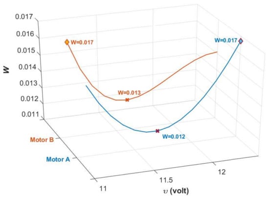 Variation of W against  from  volts until  volts. The plots show that  for Motor A and  for Motor B.
