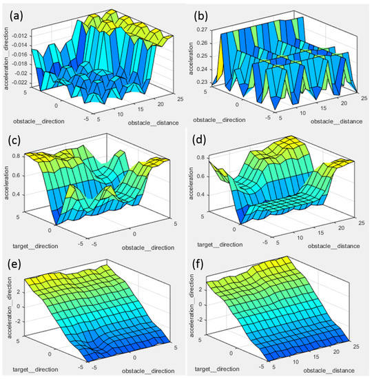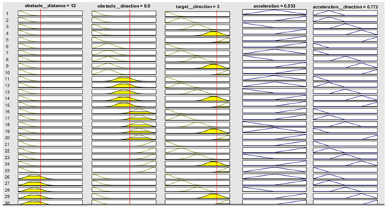 | Rule No. | Obstacle Distance | Obstacle Direction | Target Direction | Acceleration (a) | Member Ship Function Values (MFs Values) | Min. Value of MFs (Mi) | Singleton Value for Acceleration (Si1) | Mi × Si1 |
