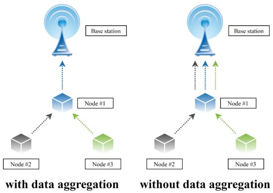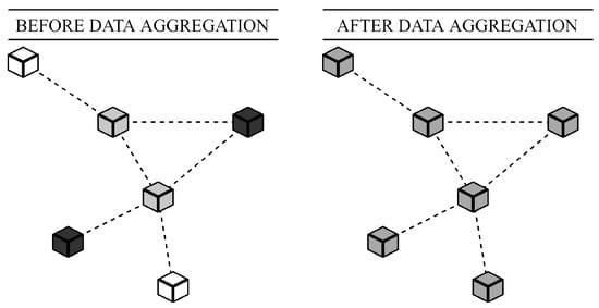 Over recent years, data (resp. information) have been becoming an increasingly valuable commodity in our technologically advanced society [,]. However, possessing an unorganized large amount of data can be counterproductive to its owner; therefore, the importance of data aggregation is gaining in importance nowadays [,,]. It is because data aggregation can ensure gathering and expressing a typically large data amount in a summary form appropriate for further processing/analyzing. Thus, data aggregation is an essential process not only in technical industries (e.g., wireless sensor networks (WSNs), the Internet of Things (IoT), etc.), but also in other fields, such as the financial sector, investments, travel industry, etc. [,,,]. In many modern multi-agent systems, data aggregation mechanisms are applied to process independently measured data from multiple sources that are often deployed in extensive geographical areas [,,]. Their application is indented to ensure sensor measurements with increased confidence, even though the precision of the sensor nodes is affected by many negative environmental factors (e.g., radiation, pressure variations, temperature, etc.) [,]. The goal of these mechanisms in multi-agent systems is to calculate/estimate an aggregate function (e.g., the arithmetic mean, the sum, the maximum/the minimum, etc.) from data measured by independent entities in order to create information that cannot be obtained by measurements executed by single sensor nodes, whereby the executed applications are optimized in many aspects []. In addition, mechanisms for data aggregation can eliminate highly-correlated or even duplicated data, thereby optimizing the overall energy consumption []. In Figure 1, we show an example of WSN with and with data aggregation.