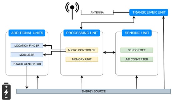 Mobile wireless sensor networks (MWSNs), a subclass of WSNs, are self-configuring and self-healing systems that consist of numerous mobile entities connected to each other via a wireless medium []. As their name evokes, mobility plays a crucial role in the execution of the MWSN-based applications []. The mobility of sensor/sink nodes in MWSNs can be achieved in different manners, e.g., equipping them with mobilizers for controlling their geographical location, fastening them to moving objects (e.g., vehicles, animals, peoples, robots, drones, etc.), etc. [,]. As stated in [], it depends on the application requirements whether sensor nodes or sink nodes (possibly both) can change their position over time (either dependently/independently of each other) after the initial deployment. The sensor nodes in these systems are versatile devices and, therefore, can sense numerous various physical quantities (e.g, temperature, light, pollution, seismic events, air pressure, motion, humidity, wind, etc.); therefore, MWSNs find application in many areas, such as healthcare monitoring, traffic monitoring, social interaction, security systems, etc. [,,]. As shown in Figure 3, the sensor nodes in MWSNs consists of three main components (namely, the sensing unit, the processing unit, and the transceiver unit), several additional units, and the energy source []. The sensing unit is responsible for sensing physical quantities of interest from the surrounding environment and converting the measured information into a digital form []. The goal of the processing unit is to process all the data and control the operation of the other components []. The transceiver unit enables transmitting and receiving data over the adjacent geographical area []. All of these components can operate due to the power supply provided by the energy source []. The additional units, such as the location finder, the mobilizer, and the power generator, allow the sensor nodes to change their geographical location and recharge the energy source, respectively []. When compared to static WSNs, MWSNs find a wider variety of applications, since the mobility of entities results in many advantages, such as reliability, cost, improved coverage, connectivity, energy efficiency, dynamic topology, increased channel capacity, etc. [,,]. Moreover, MWSNs can easily monitor also moving targets (e.g., animals, people, chemical clouds, etc.) []. However, mobility may cause several issues, e.g., reliable data transfer, contact detection, mobility control, mobility-aware power management, latency problems, etc. [], and thus, reaching a consensus in the mobile systems is more complicated than in their static variant [].