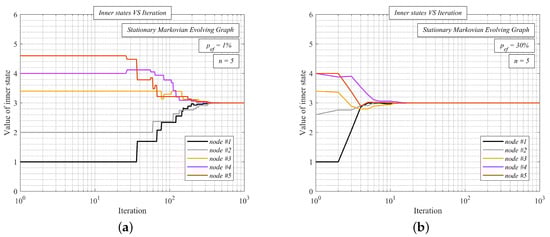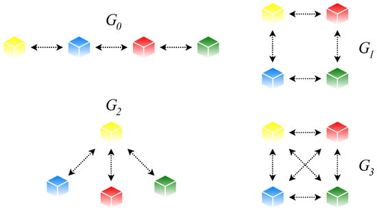 Thus, MWSNs are represented by the undirected simple finite initial graph G, which has the stationary distribution of the corresponding Markov chain, and a sequence of undirected simple finite graphs forming a stationary Markov chain, i.e., (G) [,]. Note that matrices describing the graphs forming a Markov chain (and also the initial graph) can have a different zero pattern (The zero pattern of a matrix is a (0,1)-matrix obtained from this matrix in such a way that each non-zero entry (or possibly non-zero) takes the value one and, analogically, each zero entry is equal to zero.), complicating reconfiguration of the weight matrix during the algorithm execution []. In Figure 4, we show an example of a graph sequence forming an evolving graph (including the initial graph).