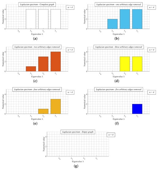 Laplacian spectrum of complete graph with order n = 4 and laplacian spectrum of its six arbitrary spanning subgraphs including empty graph. (a) Complete finite graph K; (b) Arbitrary subgraph H obtained by removing one arbitrary edge from K; (c) Arbitrary subgraph H obtained by removing one arbitrary edge from H; (d) Arbitrary subgraph H obtained by removing one arbitrary edge from H; (e) Arbitrary subgraph H obtained by removing one arbitrary edge from H; (f) Arbitrary subgraph H obtained by removing one arbitrary edge from H; (g) Empty graph H obtained by removing one arbitrary edge from H.