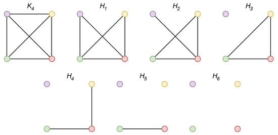 In Figure 5, we provide a valid example of Theorem 2—the Laplacian spectrum of the complete finite graph with the order n = 4 and its six arbitrary spanning subgraphs. We can see from the figures that the largest Laplacian eigenvalue of the complete graph is greater than/or equal to of its every spanning subgraph (compare Figure 5a with Figure 5b–g), and is greater than/or equal to of its every spanning subgraph. Thus, it is seen from the presented results that the expressions (12) and (13) are valid. In Figure 6, we show the graphs whose spectrum is depicted in Figure 5.