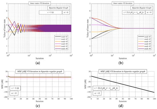Accordingly, as seen above, is the upper bound ensuring that the convergence condition (8) is met in each spanning subgraph of K. The values of the largest and the second smallest eigenvalue of the complete finite graph K can be easily determined by a mechanism for estimating eigenvalues or according to the graph order n determinable by various different techniques, such as AC, for graph order estimation, tagging, ordered numbering, etc. [,,,,]. Now, it remains to define how the diagonal elements (i.e., the weight for the current inner state at a sensor node) have to be updated in order to meet the convergence conditions (6) and (7). These conditions are met, provided that the sum of all the entries in each row/column is equal to one. As each node v receives d(k) messages at a kth iteration, the sum of the weights for all the received states can be determined, as follows: