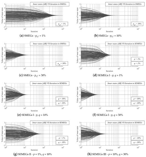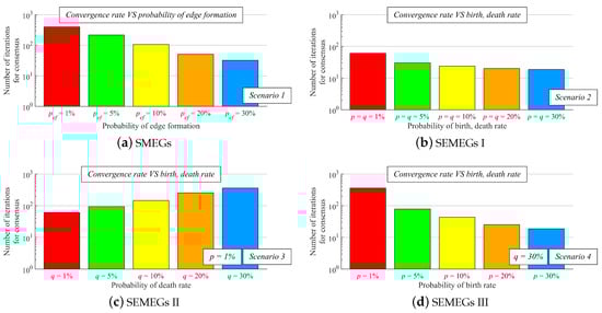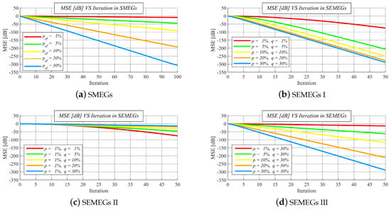 As already mentioned, we analyze MSE over the iterations in Part I. From the results shown in Figure 11a–d, we can see that an increase in the iteration number ensures a decrease in MSE for each p and for each pair p, q. In SMEGs, it can be observed that even also for p = 1%, when the most graphs from Markov chains are disconnected, MSE slightly decreases. Additionally, it is observed that the algorithm achieves higher performance in graphs of higher connectivity (ensured by an increase in p in SMEGs, an increase in both p, q in SEMEGs I, a decrease in q in SEMEGs II, and an increase in p in SEMEGs III) than in the less connected ones. So, the most important fact demonstrated by these results is that the convergence is ensured over various mobile systems when the matrix that is provided in (33) is applied.