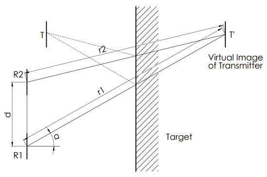 To use these considerations for an indirect measurement—the reverberation of transmitted signal is sensed by the receivers, where the echo was reflected from the measured object—the transmitter has to be located according to Figure 3. The calculation is similar to the direct measurement, only the transmitter position is changed, resulting in Formula (2).