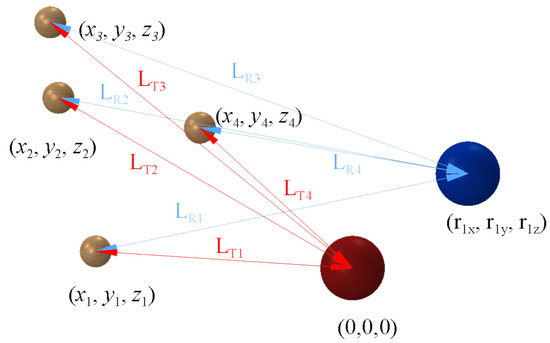 The position of the transmitter can be selected as the origin (0, 0, 0), measured from here, the position , , of every sensor is given as it can be seen in Figure 6.