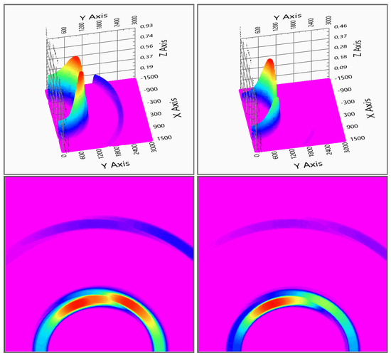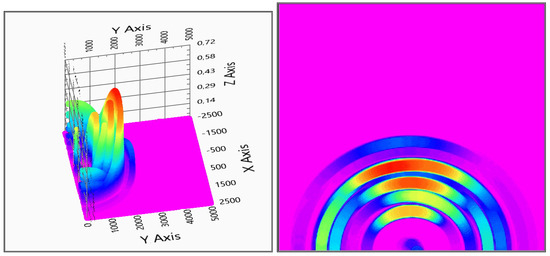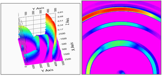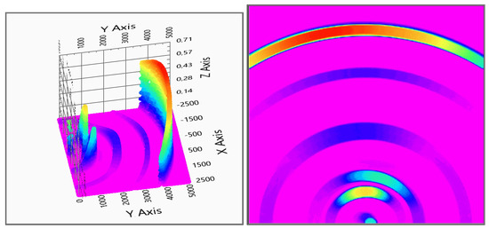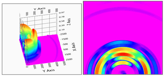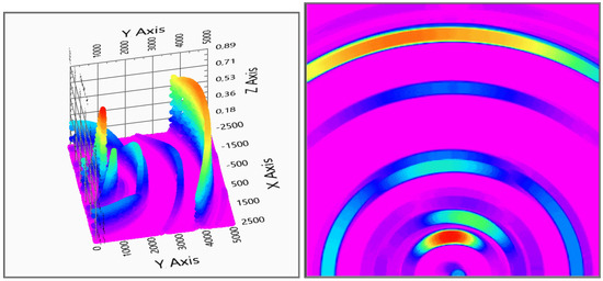There were no real difference in the results between materials, and hard surfaced materials were inspected, like wood, metal, plastic, concrete. However, the rubber ball made a double echo—one from the front and one from the back side—see Figure 20 and Figure 21. The conclusions from this phenomenon are that the particular proportion of the ultrasonic wave can cross the rubber wall and reflect from the back wall of the ball, as it can be seen in Figure 20 and Figure 21. The measurement was also possible in the “shadow” of the ball, and, because the signals already crossed the ball, the sensing of the echo from the second coat hanger is significantly lower (Figure 20).