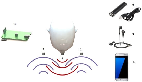 Figure 10 gives the main parts of the system. The signals from the transmitter (1) are measured with the two receivers (2). Getting the whole system to work needs a logic unit (3) that calculates based on the fusion algorithm the depth map. After the positions and the sizes of the objects have became known, a smartphone (4) converts the information to a detectable feedback tone through a headphone (5), and, based on this tone, the person can recognize where the noise is coming from (i.e., position of the obstacle) and magnitude is the intensity (i.e., size of the obstacle). A power source (6) is also needed for the system to work.