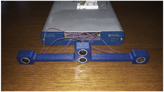 For the measurement not a smartphone was used for the calculations, but an NI interface and Labview software for the faster debugging, and a PC to acquire the data live. To make the system fully portable and usable, to use an individually developed PCB is planned with a programable microcontroller i.e., PIC32MX695F512H from Microchip. In addition, more compact ultrasonic sensors are to be used like MEMS sensors i.e., SPU0410LR5H-QB. The measurement module is built up from one transmitter and three receivers as Figure 11 shows, and every measurement was accomplished with both three and two receiver setup. In case of every measurement, the evaluation area is 5 m × 5 m with a 1 cm resolution. The sensors can detect signals from as far as 8 m, but for higher distances than 6 m, the received signals are not always—for smaller obstacles—distinguishable enough from the electronic noise, and are thus not accurate enough to evaluate. The maximum distance can be extended with better amplifier circuits for the receivers or the signal output power of the transmitter has to be raised.