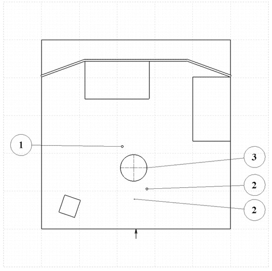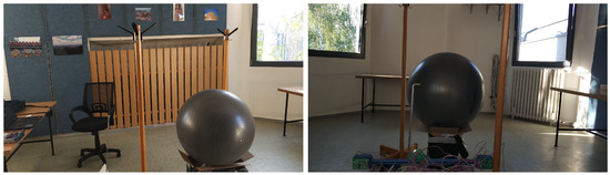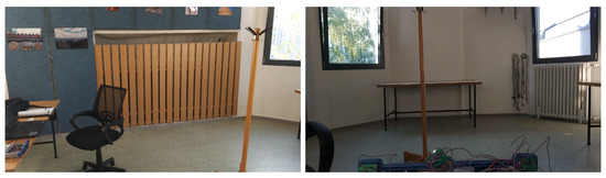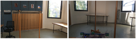 In our case, the accuracy is determined by the sampling rate and the speed of the sound. The test system’s sampling rate for the whole system is kHz, but the sampling rate is lower for the separate sensors. In the case of three sensors, the sampling rate is kHz, i.e., the third of the whole system’s is due to the multiplexing. From this , the sampling time s is given, which results in the resolution to be mm if calculated with the nominal speed of the sound m/s. The second influencing parameter is the speed of the sound, which changes depending on the environment. In the realistic cases, this factor lies in the interval from m/s to m/s. This implies deviation from the nominal speed less than . Projected to the border of the measured area with 5 m radius and taking into account the variation of the humidity and the temperature, the accuracy is cm. However, in realistic cases, the environment is constant or slowly changing, between two measurements; thus, practically, the accuracy is given solely by the sampling rate. Of course, the absolute measurements have still errors, but, in the relative cases, it does not affect the working of the system. A measurement environment is built up, based on the calculated limitations, which can be seen on Figure 12.