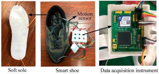 In this section, we briefly introduce the smart shoe designed for exoskeletons. As shown in Figure 1, it was developed with a soft sole made of silicone rubber with Hardness Shore 35A (Ecoflex0035, SmoothOn Inc., Macungie, PA, USA), two 3D motion sensors (MPU9250, InvenSense, San Jose, CA, USA), and a self-designed data-acquisition instrument. There were three pneumatic chambers at the heel, arch, and forefoot of the sole, respectively, since the major weight is distributed on the heel and forefoot in the case of a normal gait, and pressure under the arch helps to detect the midstance phase [31,32]. A barometer (MS5637-02BA03, Measurement Specialties Inc., Fairfield, NJ, USA) was enclosed in each chamber to measure air pressure when the wearer walked on the ground. The 3D motion sensors mounted at the heel and forefoot were developed with a gyroscope, an accelerometer, and a magnetometer to provide the foot motions. A microprocessor (STM32f103, STMicroelectronics Inc., Geneva, Switzerland) and a Wi-Fi module (CC3200R1M2, Texas Instruments Inc., Dallas, TX, USA) were integrated into a printed circuit board. Air pressure (with an accuracy of ±1.5 mbar in the three pneumatic chambers, orientations (accuracy of ±0.01°) of the heel and forefoot, and angular velocities (accuracy of ±0.05°) of the heel and forefoot were acquired with a sampling rate of 100 Hz, and then transported to a personal computer by the Wi-Fi module on the data-acquisition instrument. The soft wearable shoes have numerous advantages, e.g., low cost, and being nonintrusive for human gait and comfortable to wearers.