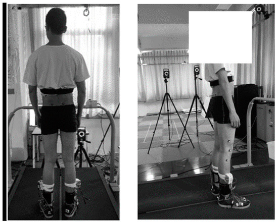 As shown in Figure 4, a gait-analysis system with a treadmill and an optical motion-capture system (from Vicon Inc., Oxford, UK) were used for validating the proposed method. The treadmill had independent belts and dual force plates to measure the ground reaction force/moment for each foot. Sixteen markers (10 mm in diameter) were fixed on the subjects’ lower limbs on the following anatomical landmarks: right and left anterior superior iliac, right and left posterior superior iliac, right and left thigh, right and left knee, right and left tibia, right and left ankle, right and left heel, and right and left toe. Ten high-speed motion-capture cameras captured the markers on the lower limbs. Signals were acquired with a sampling rate of 100 Hz. After a practice phase, all subjects were required to walk on the treadmill at three walking-speed levels (0.8, 1.2, and 1.6 m/s). Two trials, denoted as Trials 1 and 2, were conducted. The subjects walked on the treadmill for 1 min and had a rest for 2 min between trails to avoid abnormal gaits due to fatigue.
