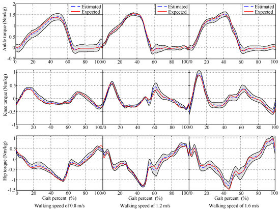 Lower-limb exoskeletons are desired to replicate human-gait mechanics, and to be “transparent” to users [1,2]. However, no breakthrough has been made in the field of transparent human–exoskeleton interaction. In human–exoskeleton systems, a high-level controller should identify humans’ planned actions, known as motion intents, and accordingly command the robot [3]. Thus, how to determine future human motion has become a key issue. As the human gait is complex, involving activities in the nervous system, musculoskeletal dynamics, and co-operation between different joints in the lower extremity, many reported methods for human-motion-intent learning were based on pattern-recognition results for simplification [4,5,6]. Switching rules and if–then decision making were usually used for designing high-level exoskeleton controllers [7,8]. This means that they are unable to handle the evolving dynamics that is not included in preset classifications. Although various improvements on information exchange were made, there are mismatches and disparities in robots’ understanding of human-motion intents in terms of continuous joint torque, especially when a human walks at unspecified speed levels [9]. This calls for a robust model to continuously estimate joint torques for the optimization of exoskeleton assistance, which can extract the time-varying movement features and diversity of gait patterns [10,11,12].