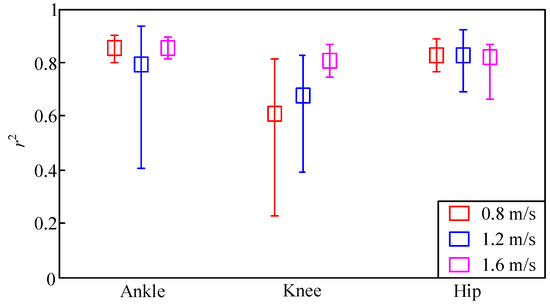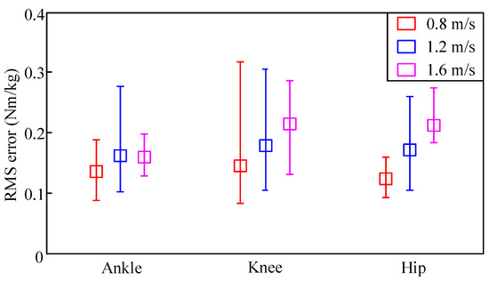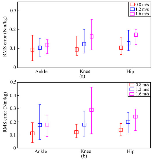 Figure 8 demonstrates the mean, maximal, and minimal values of r2 in that case. The mean, maximal, and minimal values of RMS errors for untrained speed levels are shown in Figure 9. Almost all estimations of the GP model for untrained speed levels failed. Thus, results are not given here. As shown in Figure 8, the mean values of r2 for the three untrained walking-speed levels were all higher than 0.6, and most were higher than 0.8. The DGP model could, therefore, be used to estimate joint torques for untrained speed levels. However, the performance of the model may have declined in comparison to the trained case. This is visible for RMS errors and r2 values. By comparing Figure 6a with Figure 8, it is indicated that the mean, maximal, and minimal values of r2 for untrained speed levels were all lower than those of the trained cases. By comparing Figure 7a with Figure 9, it is indicated that the mean, maximal, and minimal RMS errors for untrained speed levels were all higher than those of the trained cases. Results were foreseeable, as gait patterns for different walking-speed levels are not necessarily the same. Meanwhile, walking-speed levels were changed with a big step size of 0.4 m/s. If we expected satisfactory results, the step size should be chosen to be smaller, e.g., 0.2 m/s.