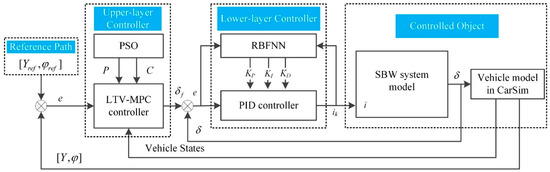 The upper-layer LTV-MPC controller, whose parameters are optimized offline with the PSO algorithm, generates the target steering angle of the front wheel. The lower-layer RBFNN-PID controller outputs the electric current required by the steer-by-wire (SBW) system for rapid tracking of the target steering angle.