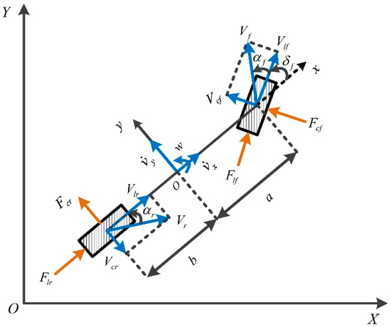 This study adopts the “bicycle model” which has been widely used to develop the prediction model of MPC [30], as shown in Figure 2. The definitions of the parameters are listed in Table 1.