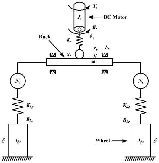 The structural of the SBW model is shown in Figure 4, which is composed of an electric motor, a rack, a steering trapezium, and directive wheels. An SBW model that models the dynamics of the electric motor and steering actuators is built. We assume that the left steering angles of front wheels and the right one is identical. We derive the following equations: