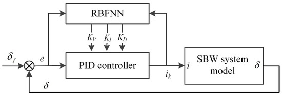 Figure 5 illustrates the architecture of the proposed RBFNN-PID controller. The PID controller’s input is the deviation of the actual steering angle from its target, while the output is the current to be executed by the electric motor. Three parameters kP, kI, kD of the PID controller are tuned adaptively with the RBFNN [35,36].