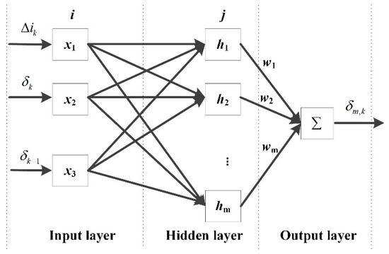 The adopted RBFNN is a three-layer feedforward network, and its structure is shown in Figure 6. X denotes the input vector of the network which consists of the PID controller’s output incremental current Δik, the actual steering angle at the present time δk, and at the previous time δk−1.