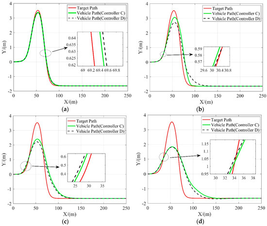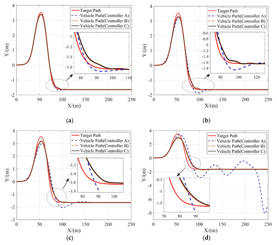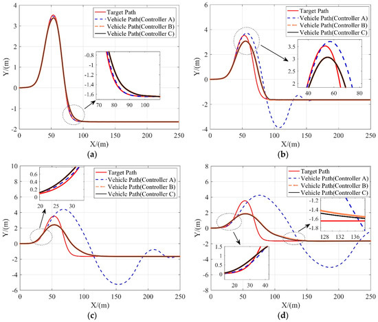 As shown in Figure 7, controller B and controller C both perform well at all speeds, while controller A can only achieve good tracking performance at relatively low speed (10 m/s). As the velocity increases, the lateral tracking deviations of controller B and controller C increase slowly, while the lateral tracking deviation of controller A increases significantly and gets much higher than another two MPC-based controllers. Besides, at the speed of 25 m/s, both controller B and controller C can still help to guarantee the vehicle’s lateral stability while tracking the reference path smoothly and accurately.