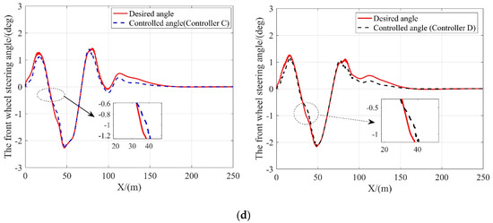 The desired and controlled steering angle of the front wheel with the controller C and D at different vehicle velocities. (a) 10 m/s; (b) 15 m/s; (c) 20 m/s; (d) 25 m/s.