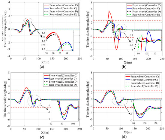Slip angle at different vehicle velocities. (a) 10 m/s; (b) 15 m/s; (c) 20 m/s; (d) 25 m/s.
